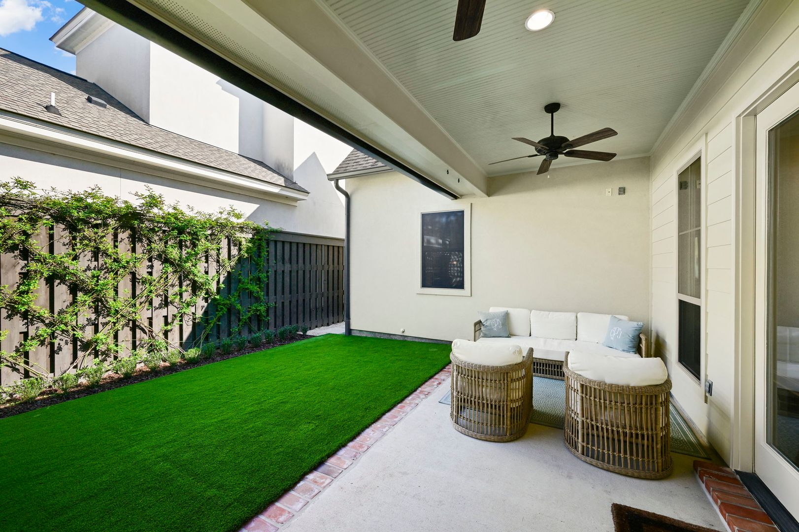 patio low maintenance with open area covered in artificial turf, brick wall with training vine foliage, concrete covered area for outdoor seating and dining. Great place to